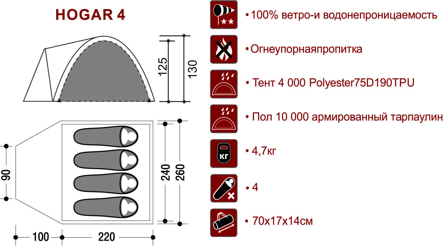 Палатка Indiana Hogar 4 — вместительная и надёжная модель для многодневных походов в условиях средней полосы, где погода может меняться несколько раз за день. Внутри свободно размещаются четверо человек, при этом вес палатки остаётся вполне походным — 4,7 кг. Каркас из стекловолокна обеспечивает устойчивость к ветру, а продуманная конструкция и штормовые растяжки помогают держать удар даже в непогоду. За защиту от дождя отвечают водонепроницаемые материалы тента и дна с огнеупорной пропиткой и защитой от ультрафиолета. Все швы дополнительно проклеены термоусадочной лентой — это практически исключает протекание. Внутри предусмотрены москитные сетки, так что насекомые не помешают отдыху. Палатка легко устанавливается даже неопытными туристами, а в сложенном виде компактно упаковывается в чехол. Модель особенно подойдёт тем, кто путешествует весной и осенью, когда погода особенно капризна. Если хочется оставаться в сухости и уюте даже во время затяжного ливня, Hogar 4 — рабочий вариант без лишних переплат.Бренд: Indiana